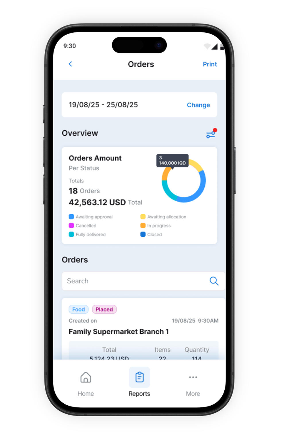 Tap into any report to explore detailed transactions, print on Bluetooth printers, or export key summaries instantly