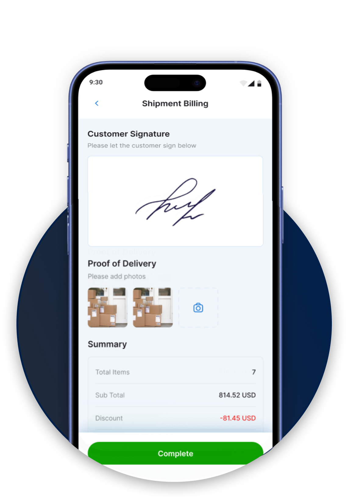 Drivers record delivery status in real time with photos, digital signatures, and auto-logged timestamps for complete traceability