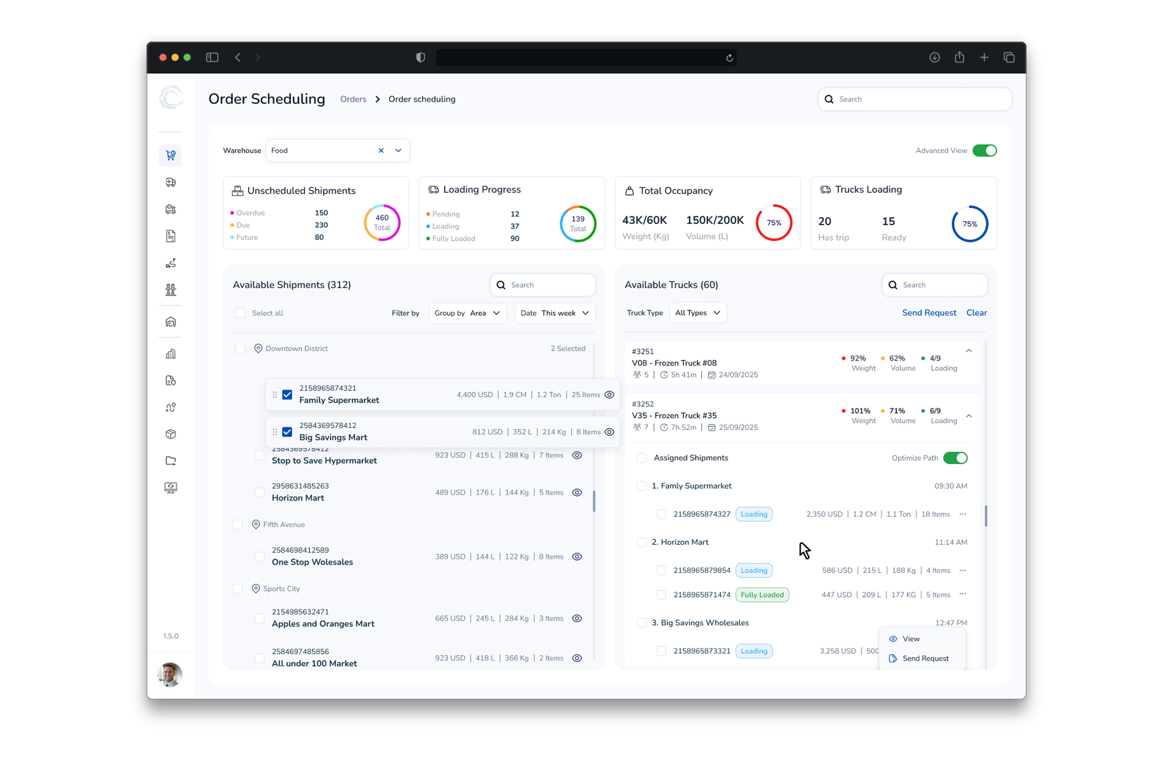 Search, filter, or group shipments by area, date, or priority. Assign them to trucks instantly with intuitive drag-and-drop control